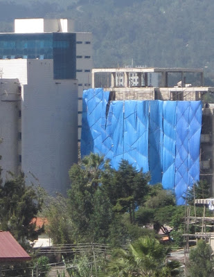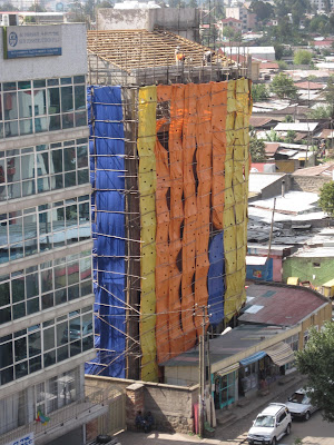 L’artiste Christo est devenu célèbre en emballant des paysages et des monuments. Avec le boom de construction qui règne à Addis, les Éthiopiens font eux aussi de l’art. Ils emmaillotent leurs édifices en chantiers.