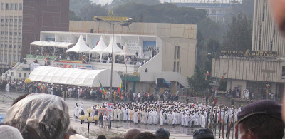 Le 27 septembre, je me suis rendue, avec des milliers d’autres Éthiopiens, sur Meskel Square, au cœur de la capitale, où se déroulaient les cérémonies. Avec toutes ces femmes et ces filles vêtues de blanc (qu’elles sont belles les Éthiopiennes!), le spectacle dans les rues était aussi intéressant que celui sur la grande place.