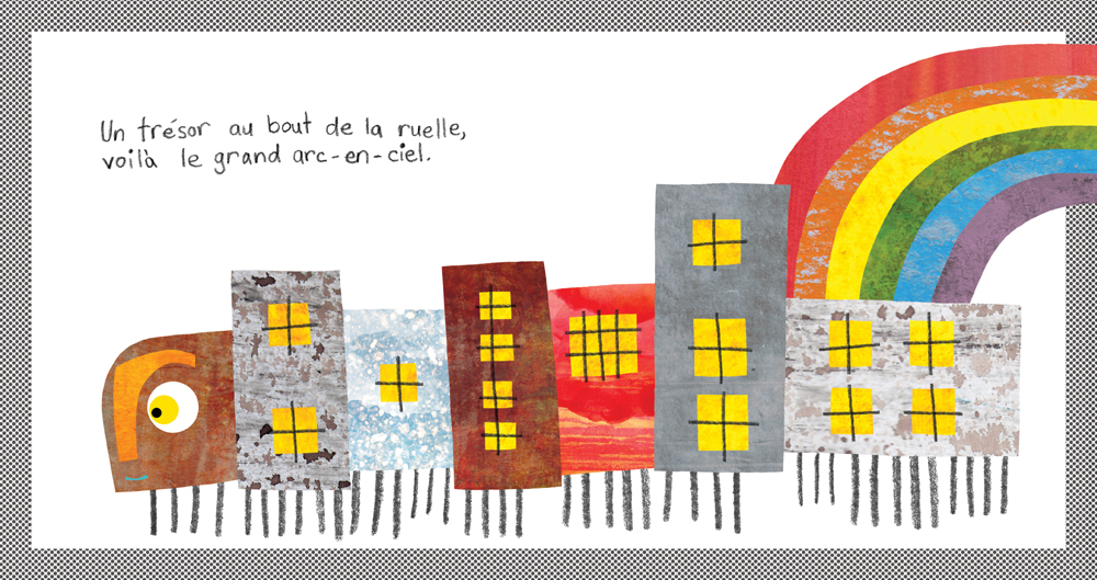 Avec un ingénieux mélange de papiers de soie, de peinture, de crayons de bois et de cire, Jacinthe Chevalier a imaginé des animaux à l’intérieur desquels elle a dessiné divers phénomènes de la météo (orage, tonnerre, éclair, brouillard, arc-en-ciel…) Fascinantes et accrocheuses, ses illustrations constituent une superbe initiation à l’art.