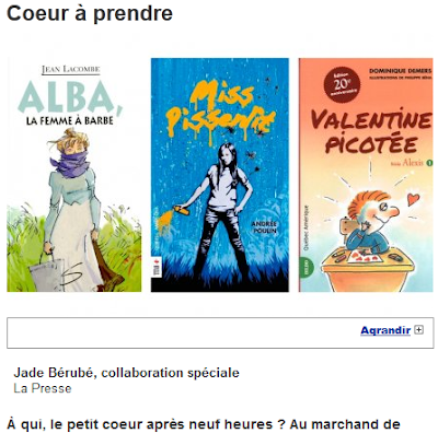 Pour reprendre l’expression d’une sympathique auteure, j’ai eu cette semaine un moment chocolat, avant même l’arrivée de la St-Valentin. Jade Bérubé, chroniqueuse à La Presse, publie un article sur des romans qui parlent d’amour et présente Miss Pissenlit comme «un incontournable».