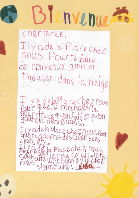 Tu vas aimer le Canada. C’est amusant ici. Il y a beaucoup de choses à faire. On prendra soin de toi et de ton frère. Des fois, il y aura des carnavals.